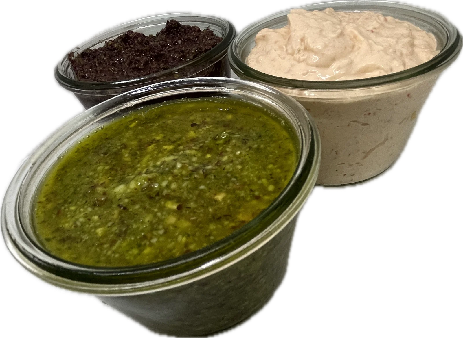 Et glas pesto, fetacreme og oliventapanade i mellemstørrelsen. En god start på en hyggelig Tapas aften.